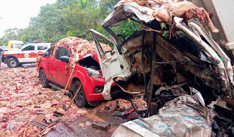 De acordo com informações da Polícia Rodoviária Federal (PRF), o acidente envolveu um caminhão carregado de restos de carne bovina, um caminhão baú, uma caminhonete e um carro de passeio. Imagens feitas no local mostram que, devido ao impacto, parte da carga ficou espalhada pela pista e os veículos tiveram a estrutura severamente danificada.