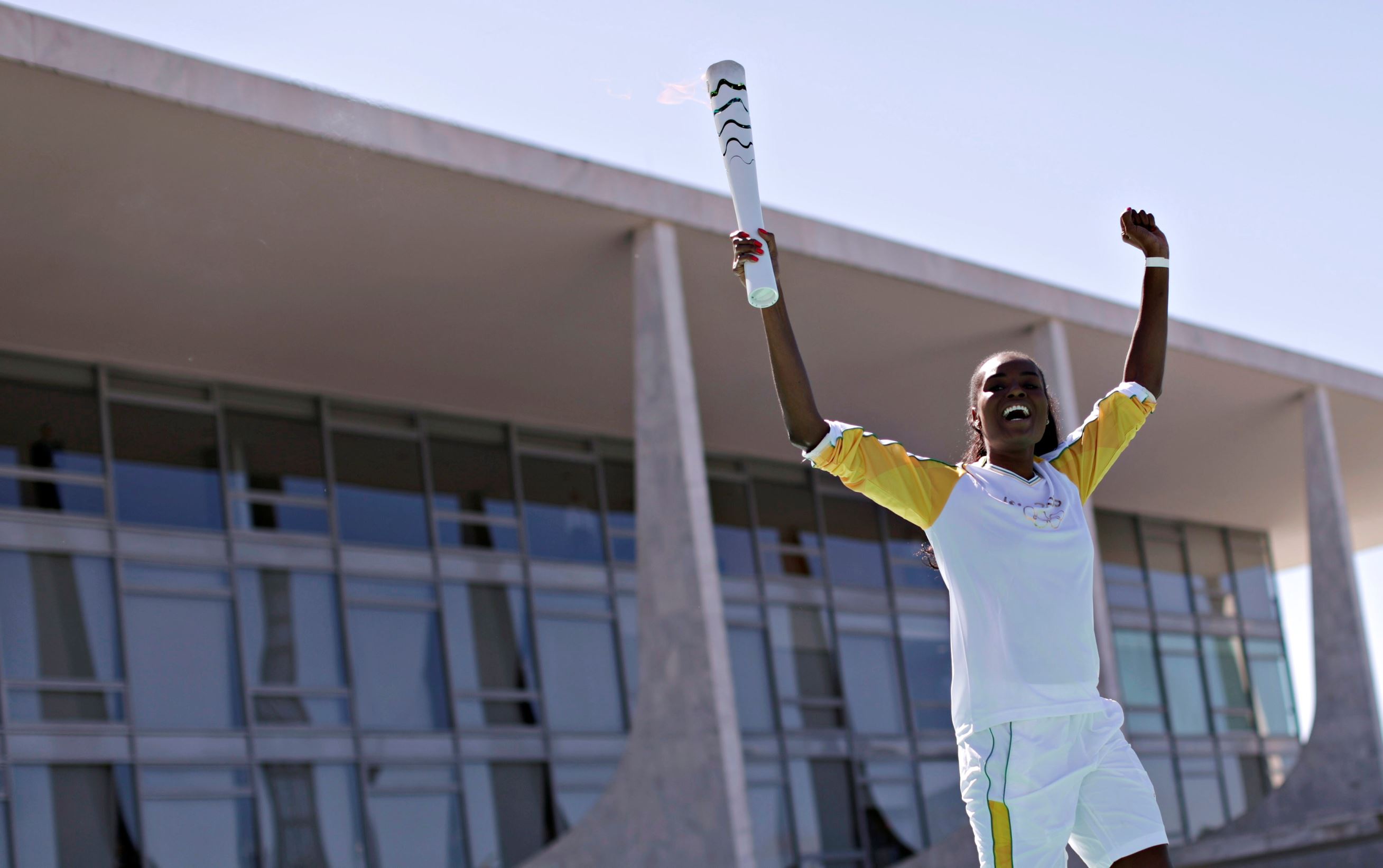A jogadora de vôlei Fabiana Claudino aplaude quando a presidente Dilma Roussef segura a tocha. Ela declarou que o Brasil está “preparado” para fazer “os melhores Jogos Olímpicos da História”