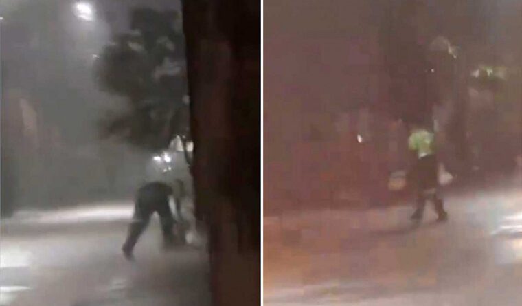 Na gravação, o trabalhador aparece recolhendo sacolas de resíduos em uma via alagada, aparentemente sem capa de chuva. Ao narrar a cena, o autor do vídeo comenta: “Ali vai o trabalhador brasileiro. A essa hora da noite, numa chuva torrencial para deixar a cidade limpa”, acrescentando que muitos profissionais enfrentam riscos enquanto exercem suas funções.